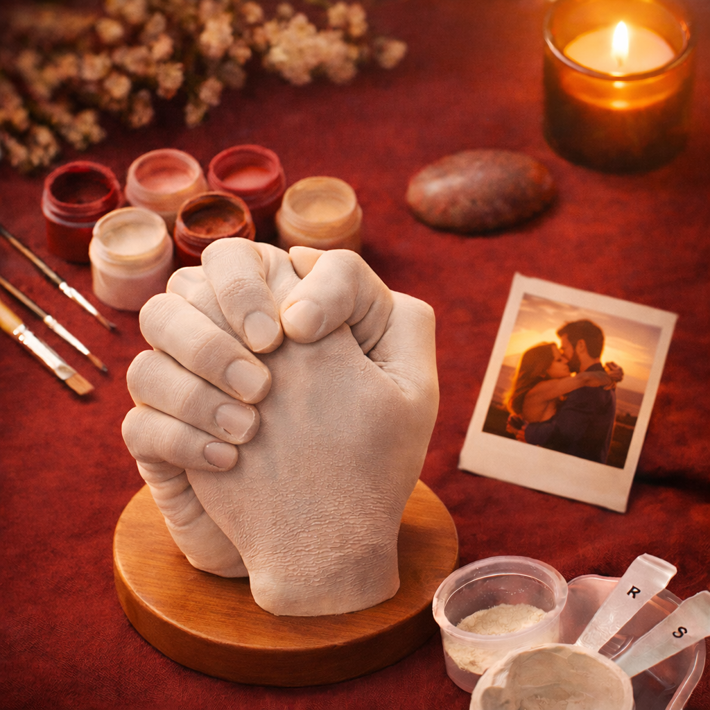 En 4 étapes simples, vous créez votre sculpture de mains, que vous posez ensuite sur son socle en bois inclus.